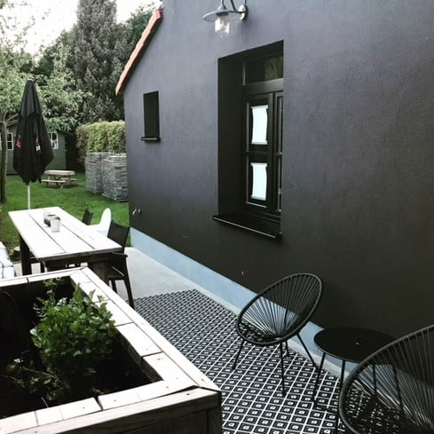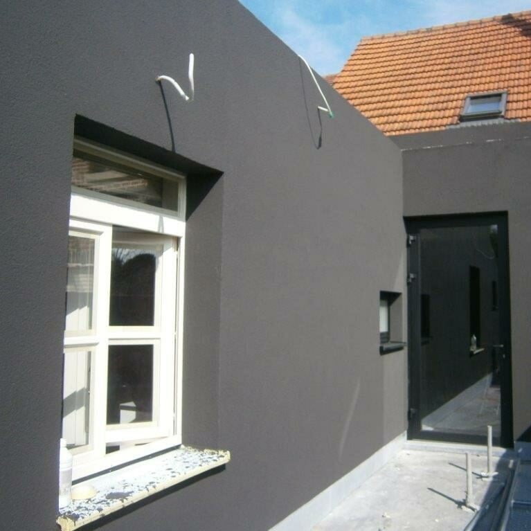 Een zwarte moderne uitvoering door het plaatsen van siliconen sierpleister met isolatie en het aanpassen van de dakranden en de raamtabletten.
